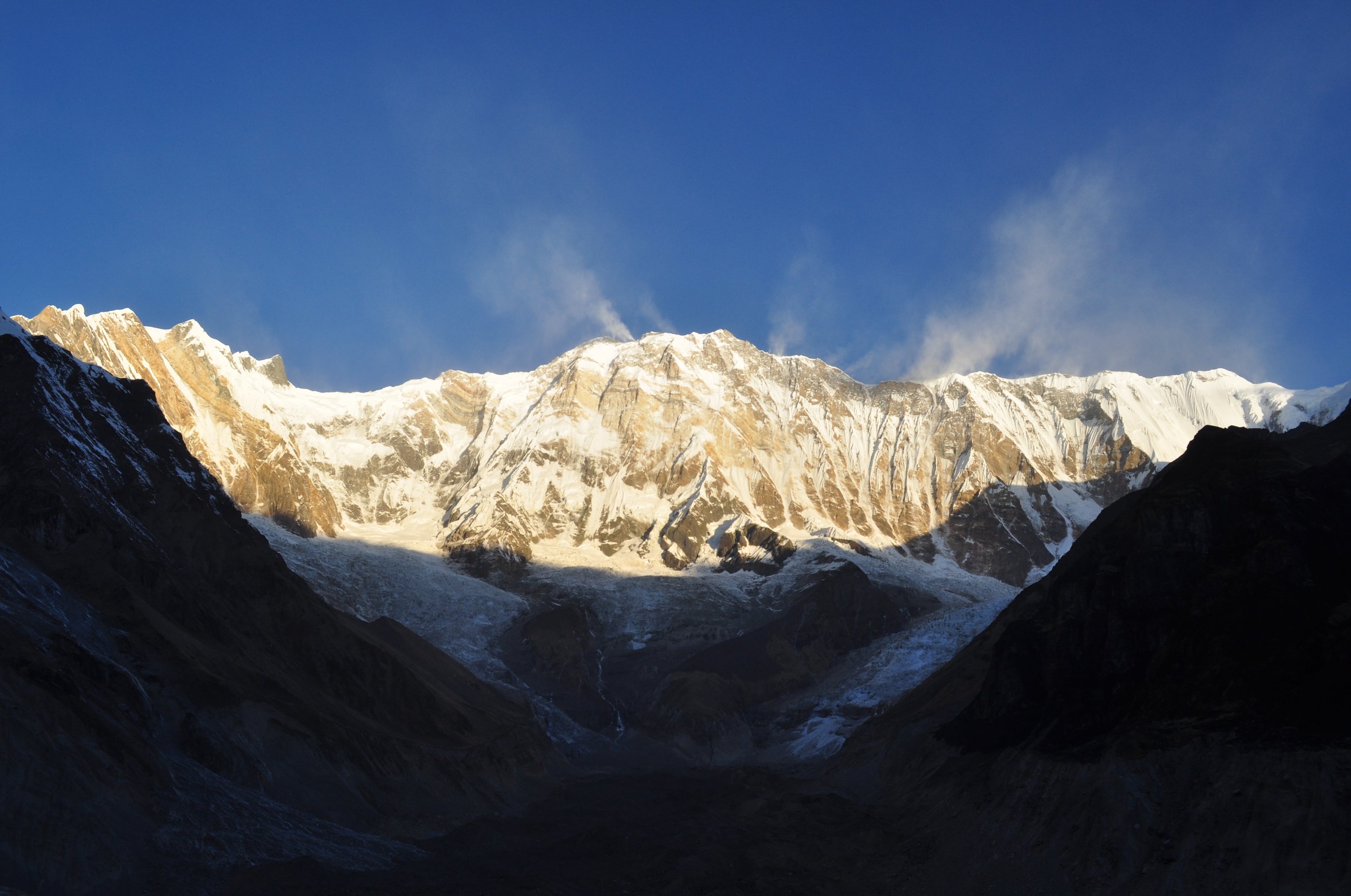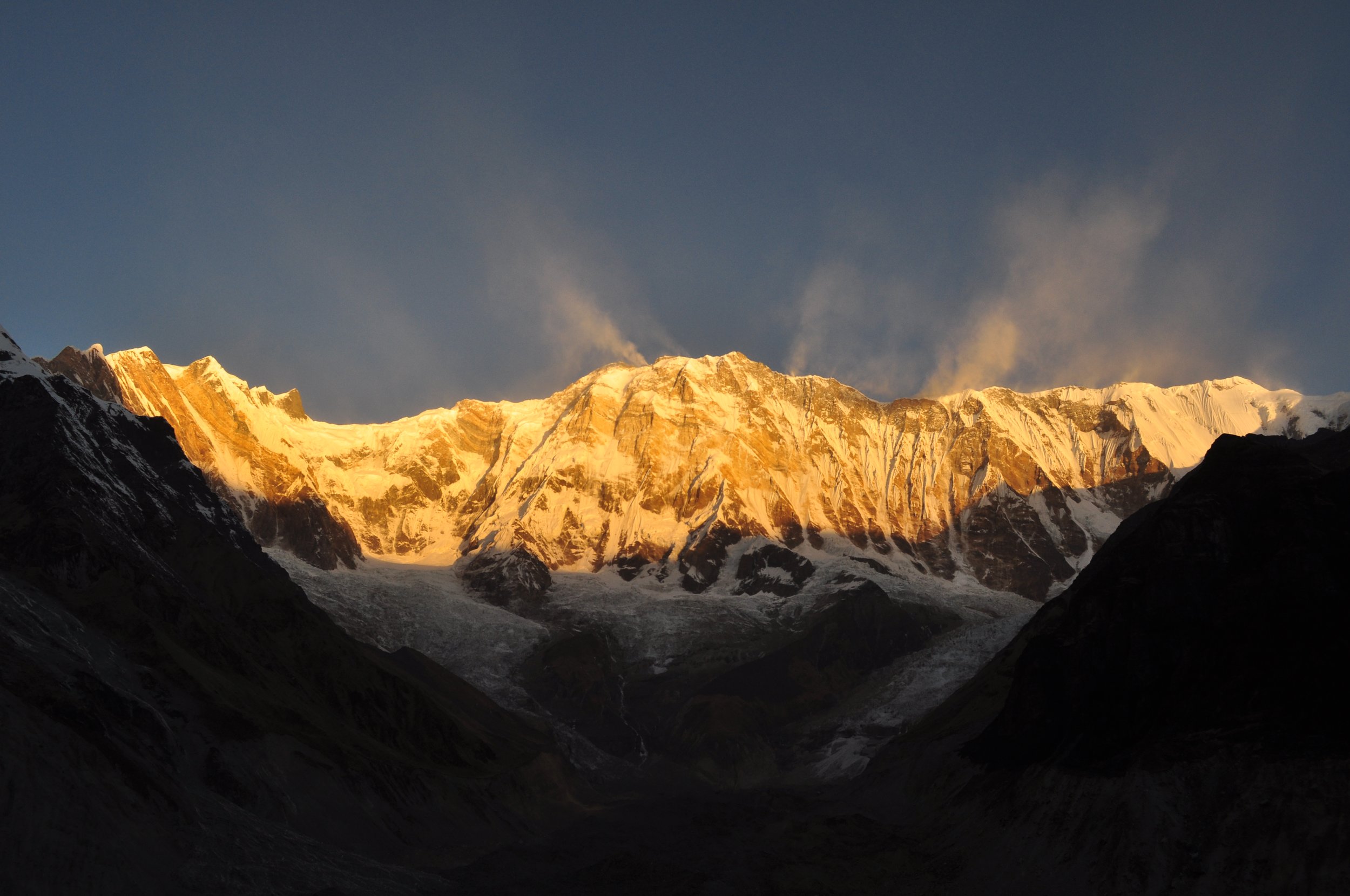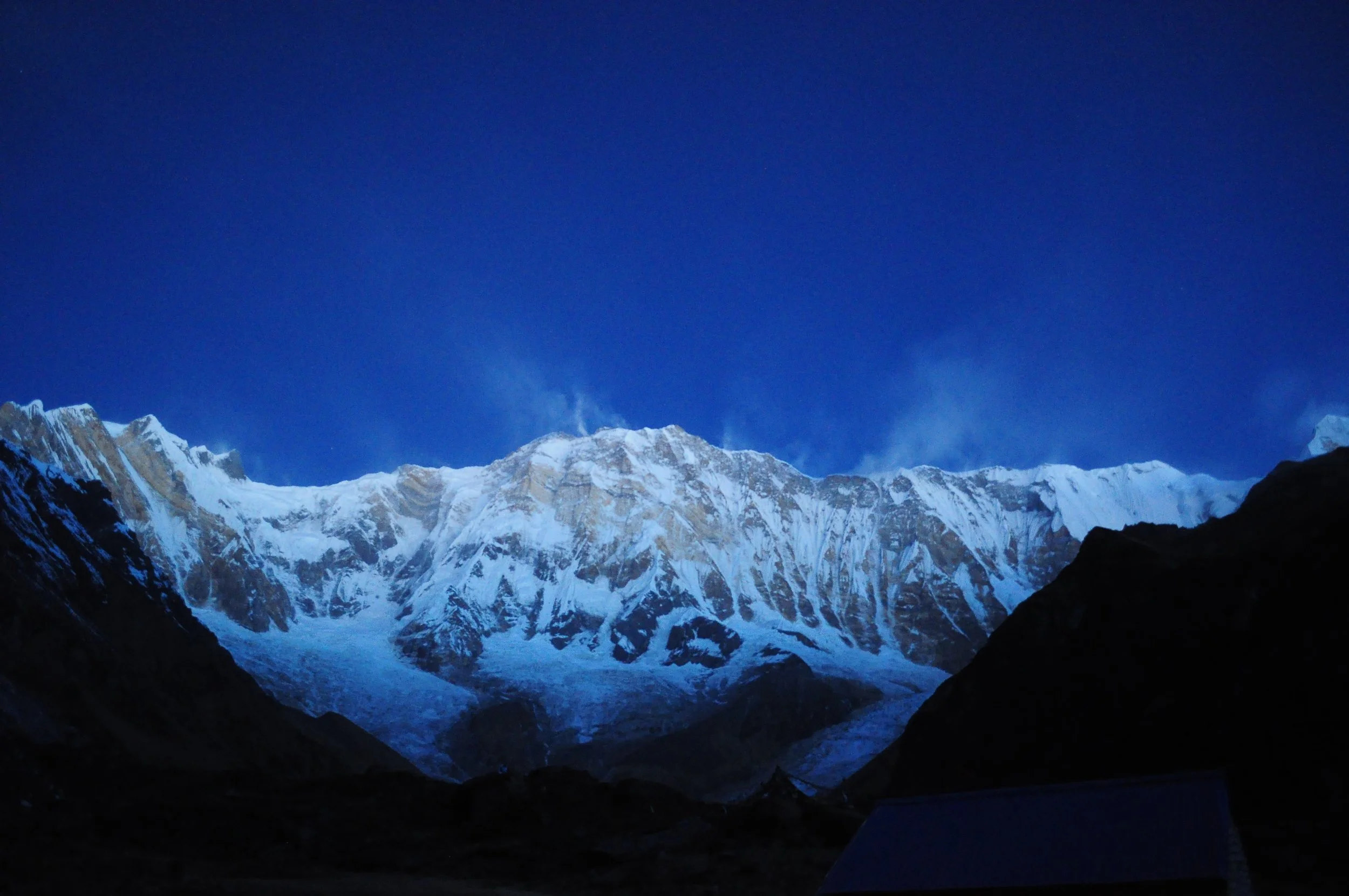 Waking up on the Annapurna is a surreal experience. It looks like being on a lunar landscape, and the colors of the sun rising on the mountain is a paradise for adventure photographers. It’s hard to keep the batteries full as they discharge visibly quickly with the cold. It starts on blue, then becomes golden, and at the end immaculate snow white. The natural sight scene lasts only for a few minutes.